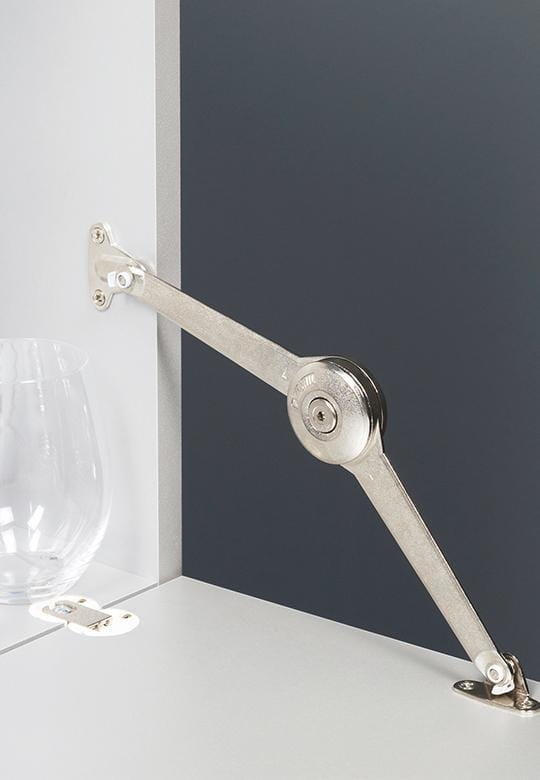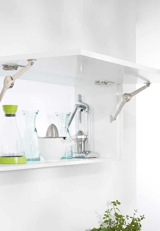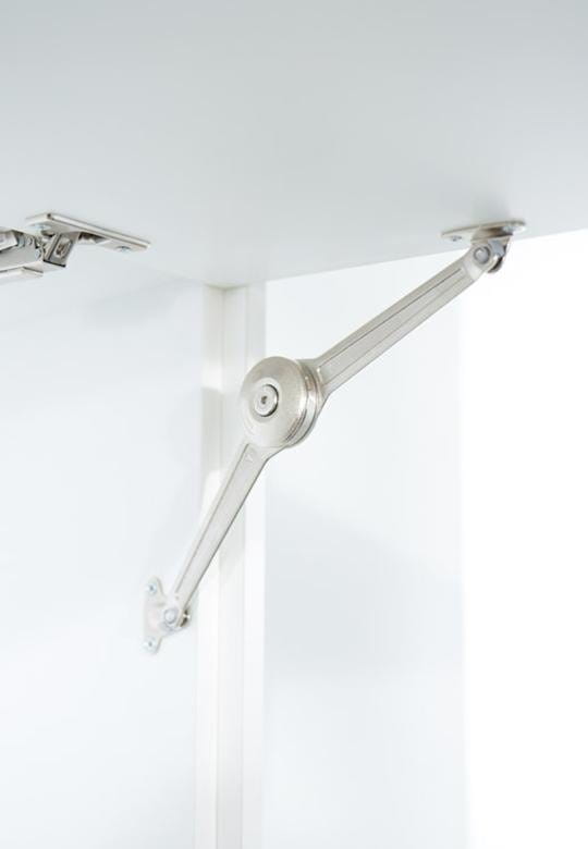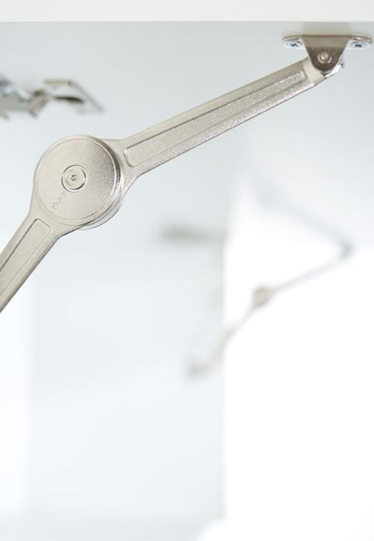 Podnośnik DUO Forte to prosty mechaniczny system przeznaczony do średnich i dużych frontów. Znajduje szerokie zastosowanie w kuchennych szafkach wiszących, gdzie pełni rolę wspornika klapy, w szafkach pokojowych typu barek, a także w meblach łazienkowych jako rozwórka klapy/frontu w systemach uchylnych koszy na bieliznę.